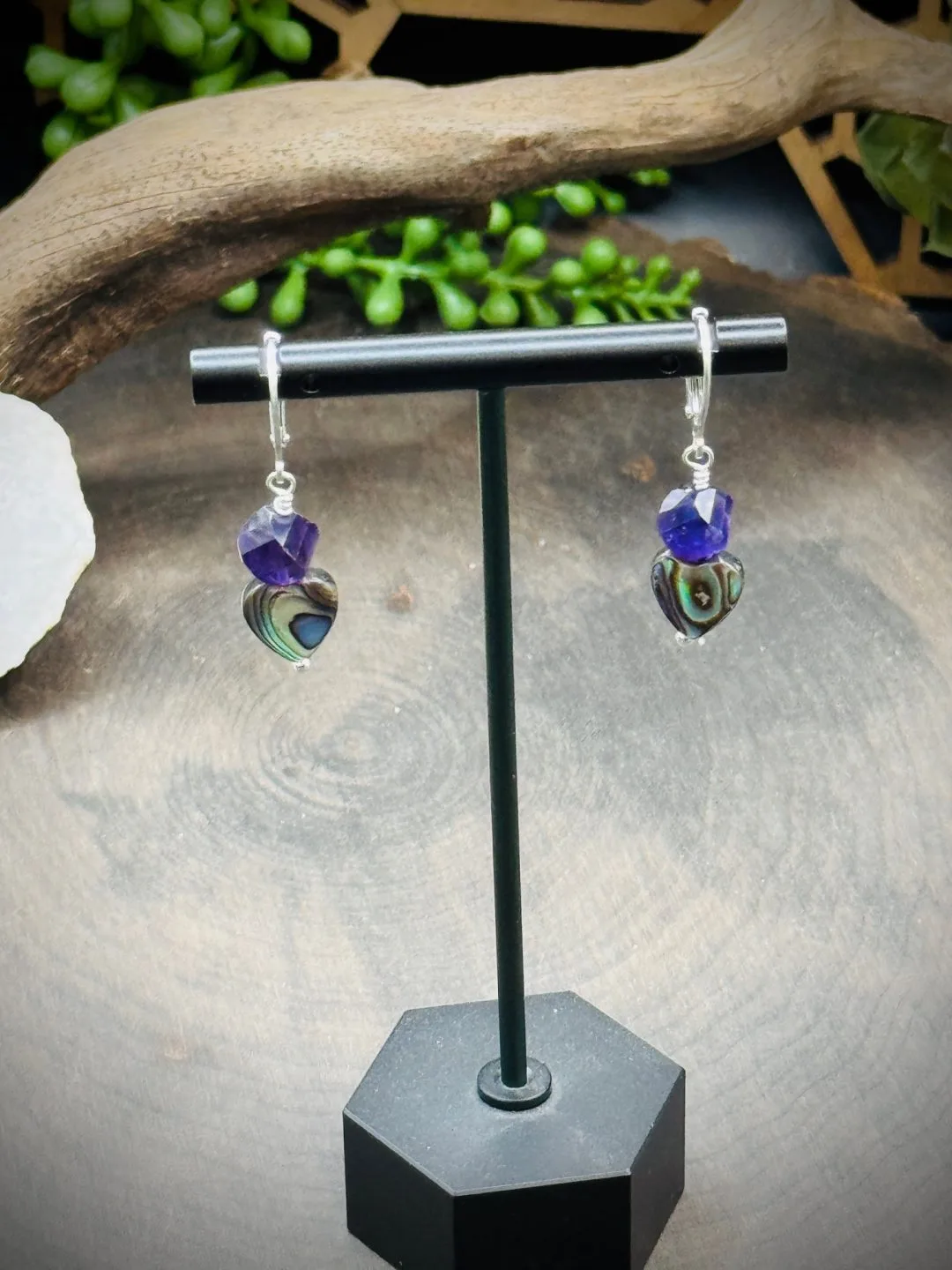 All About the Beads Earrings Amethyst & Heart Shaped Abalone Beads. With Lever Back Ear Wires.
