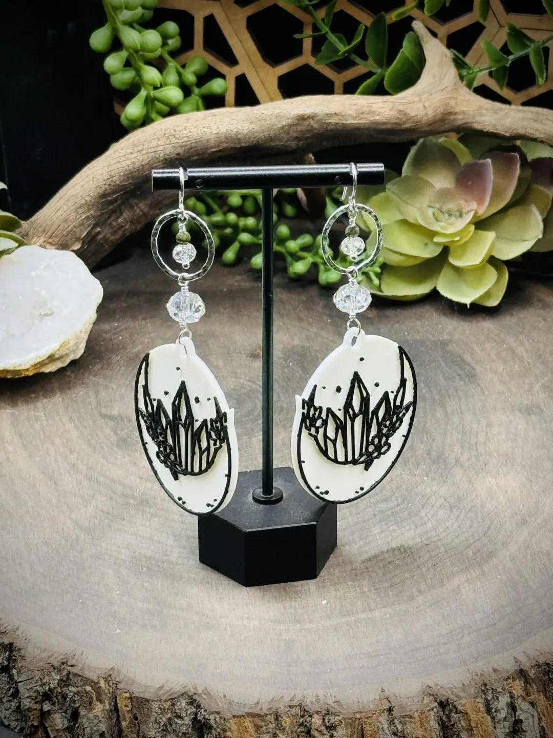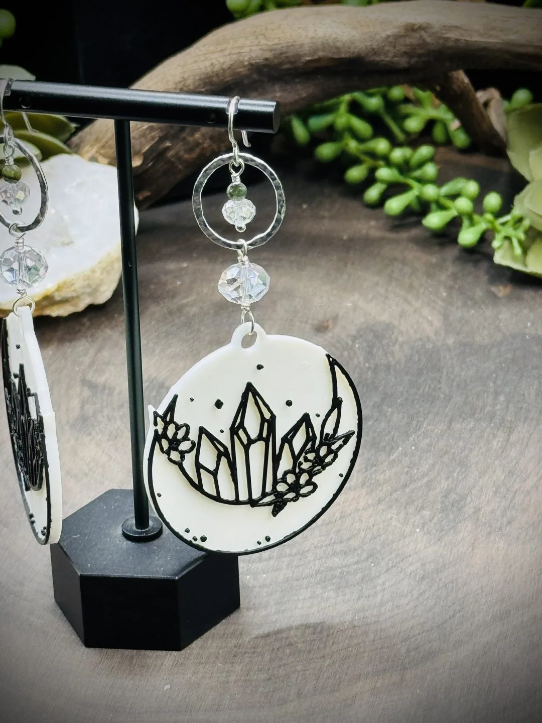 Elegant Fine Silver Oval Earrings with Green Garnets, Clear Quartz, & 3D Printed Moon with Crystals