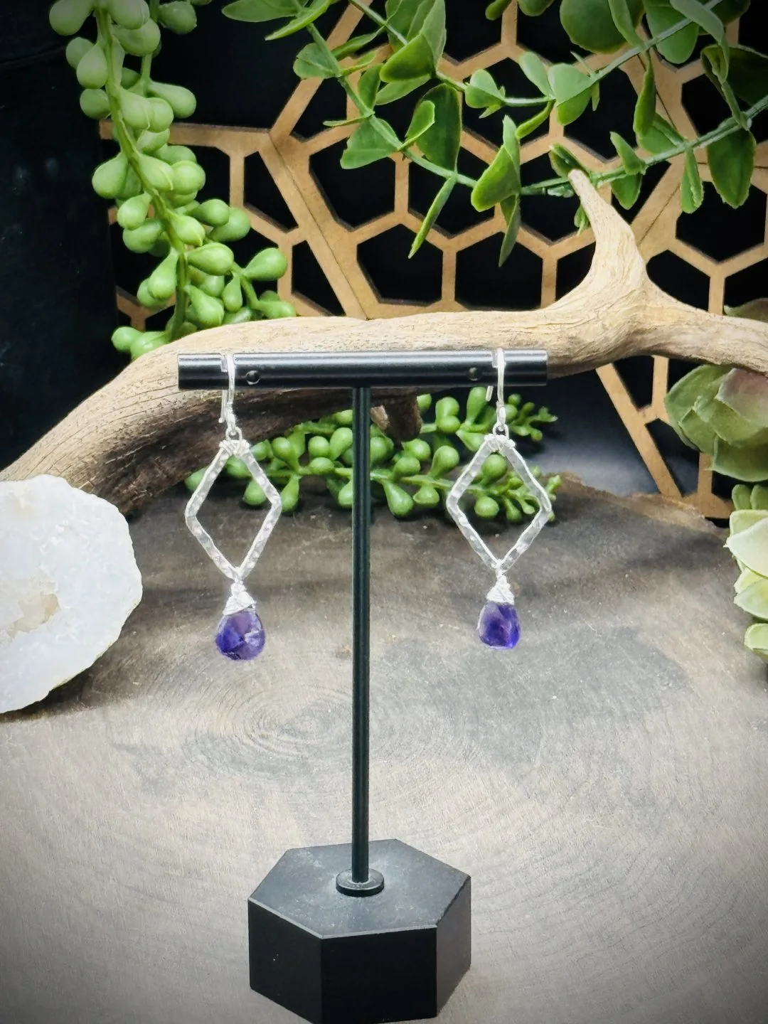 Dainty Diamond Shaped Hoops with Amethyst Teardrops