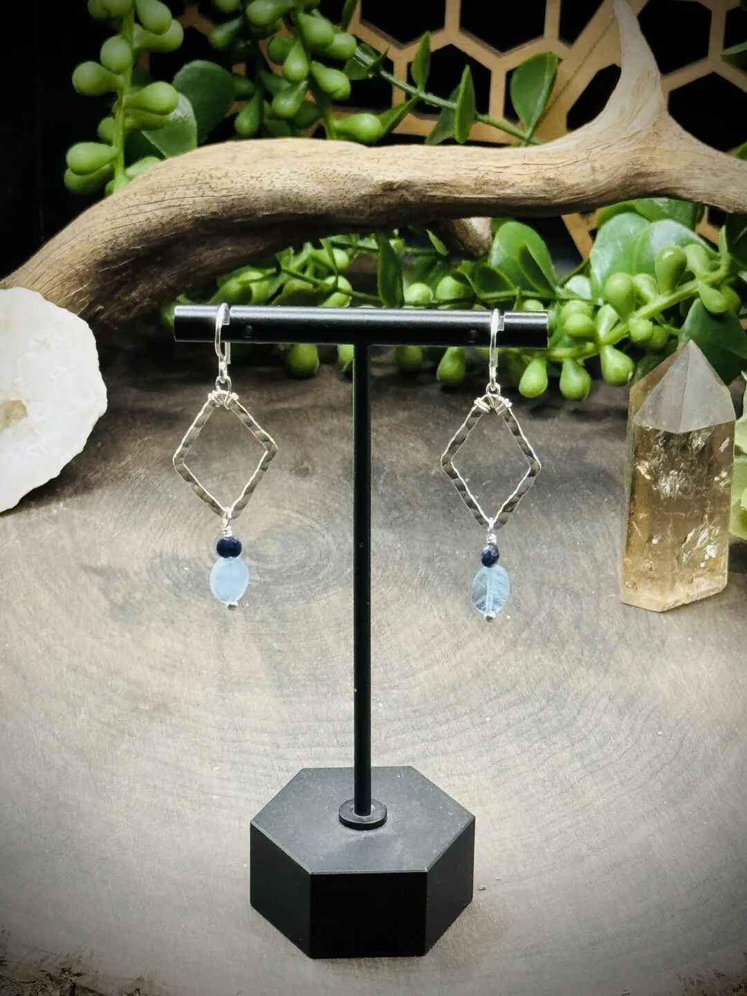 Dainty Diamond Shaped Hoops with Aquamarine & Sapphires