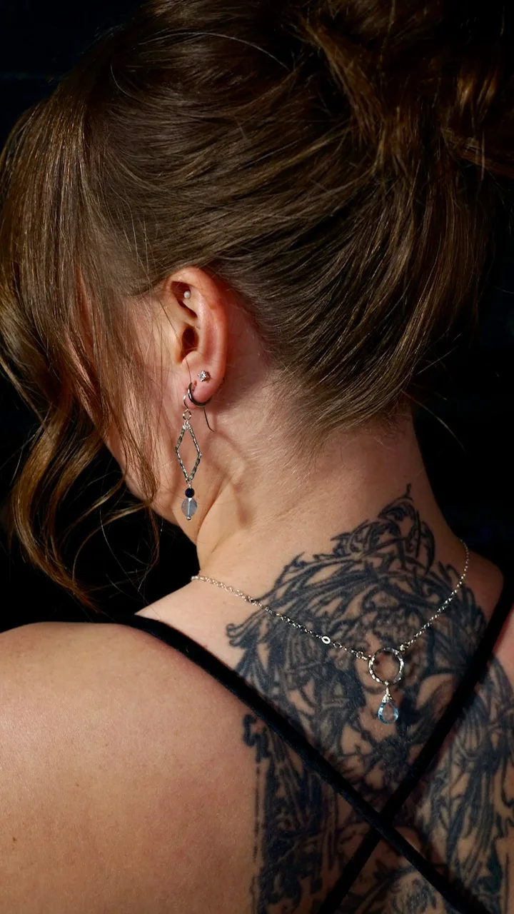 16g Fine Silver Small Diamond Shaped Hoops with Aquamarine & Sapphires Beads.