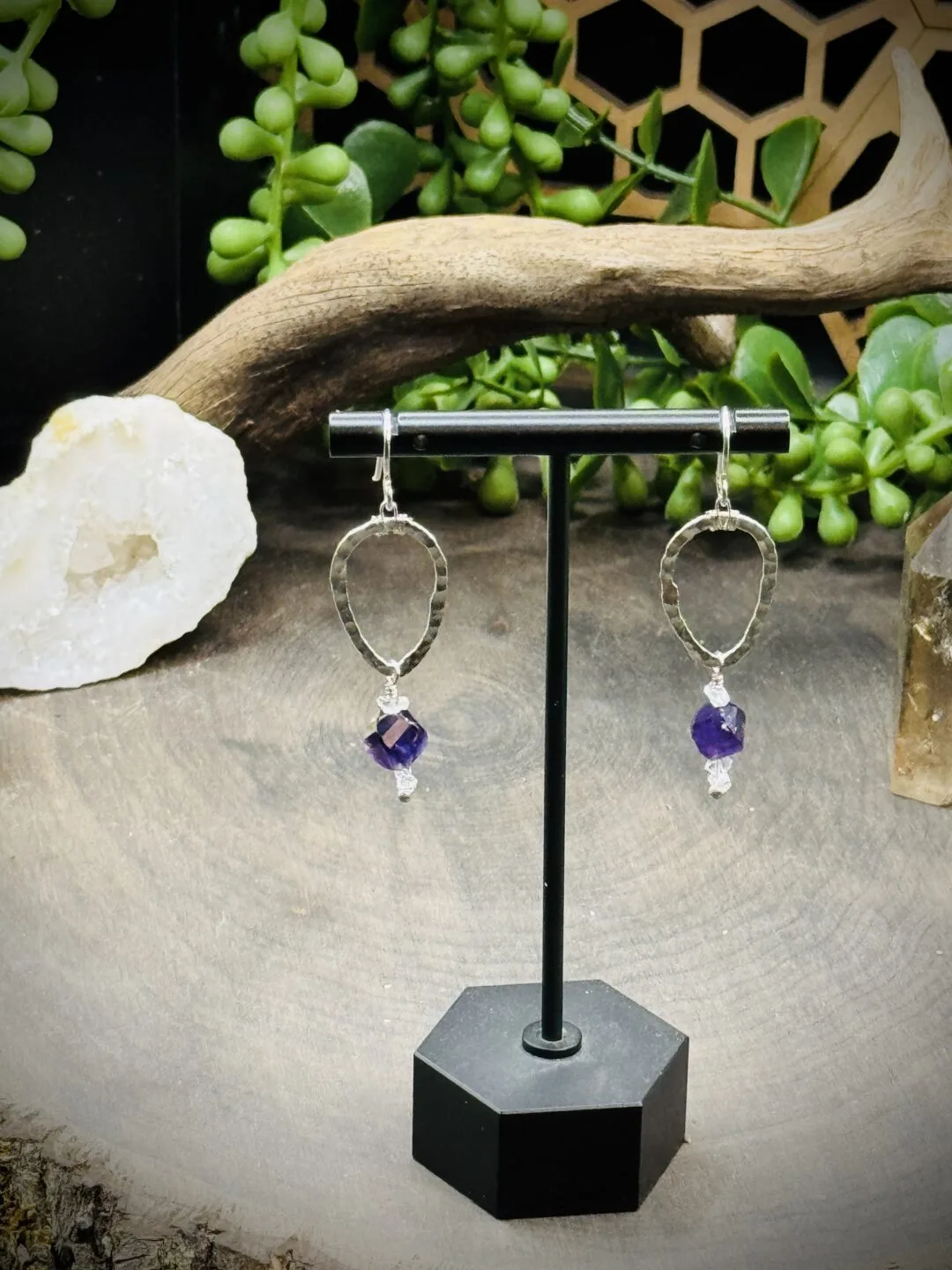 Dainty Teardrop Hoops with Amethyst & Herkimer Diamonds