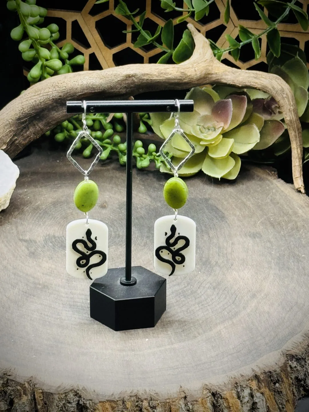 Elegant Fine Silver Diamond Shaped Earrings with Jade & 3D Printed Snakes