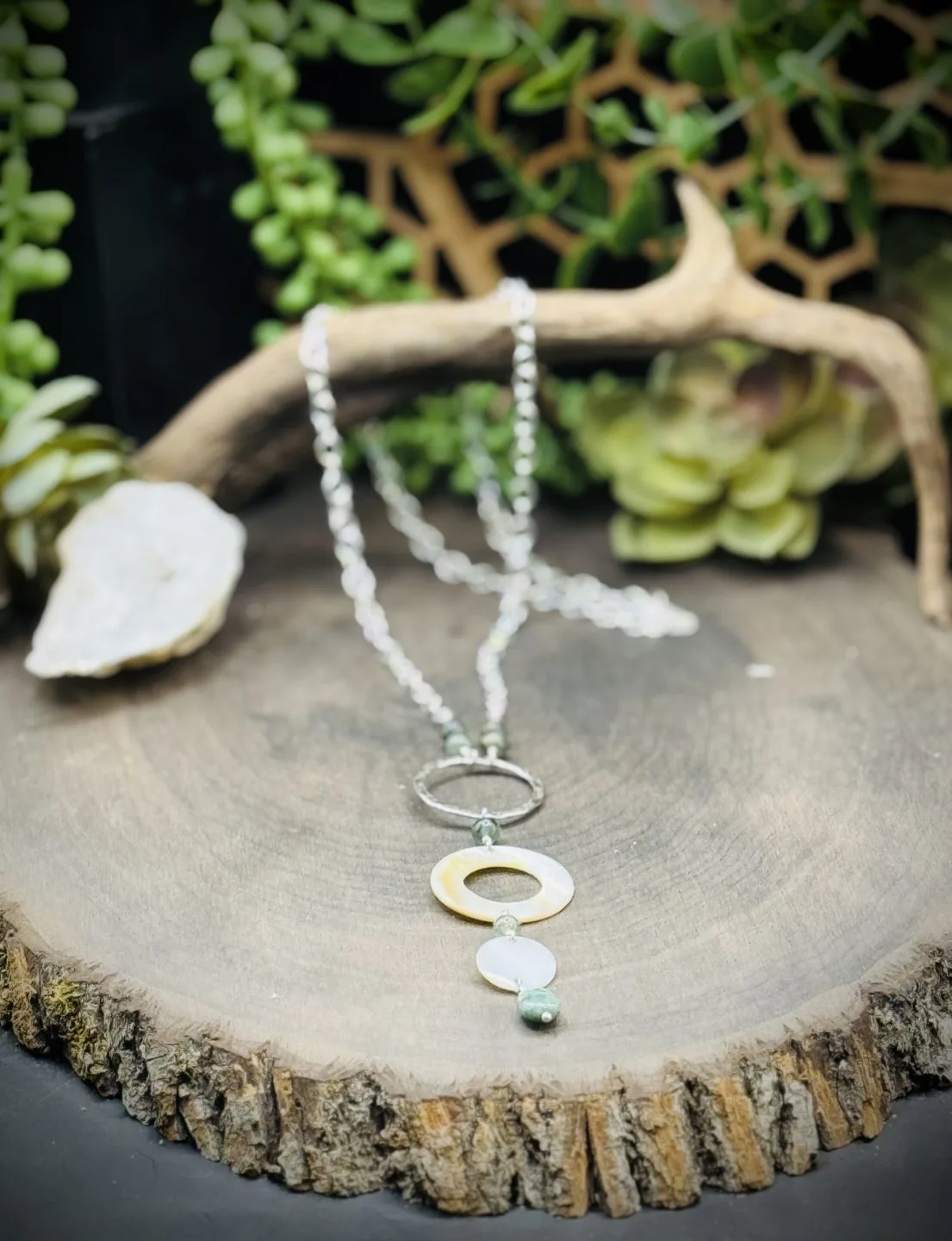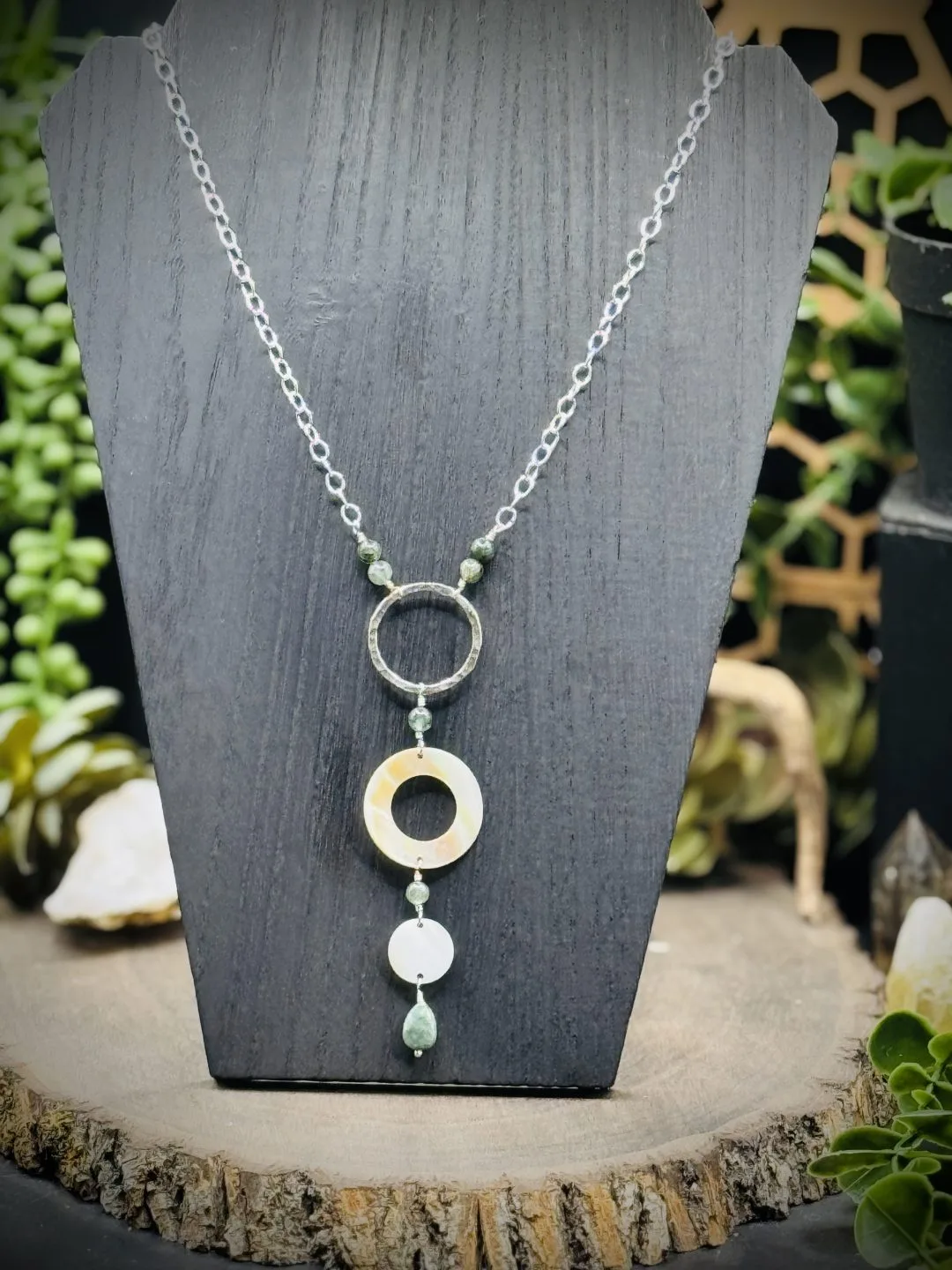 Elegant Hoop Long Necklace with Vintage Natural Shell, Jade, & Burma Jade