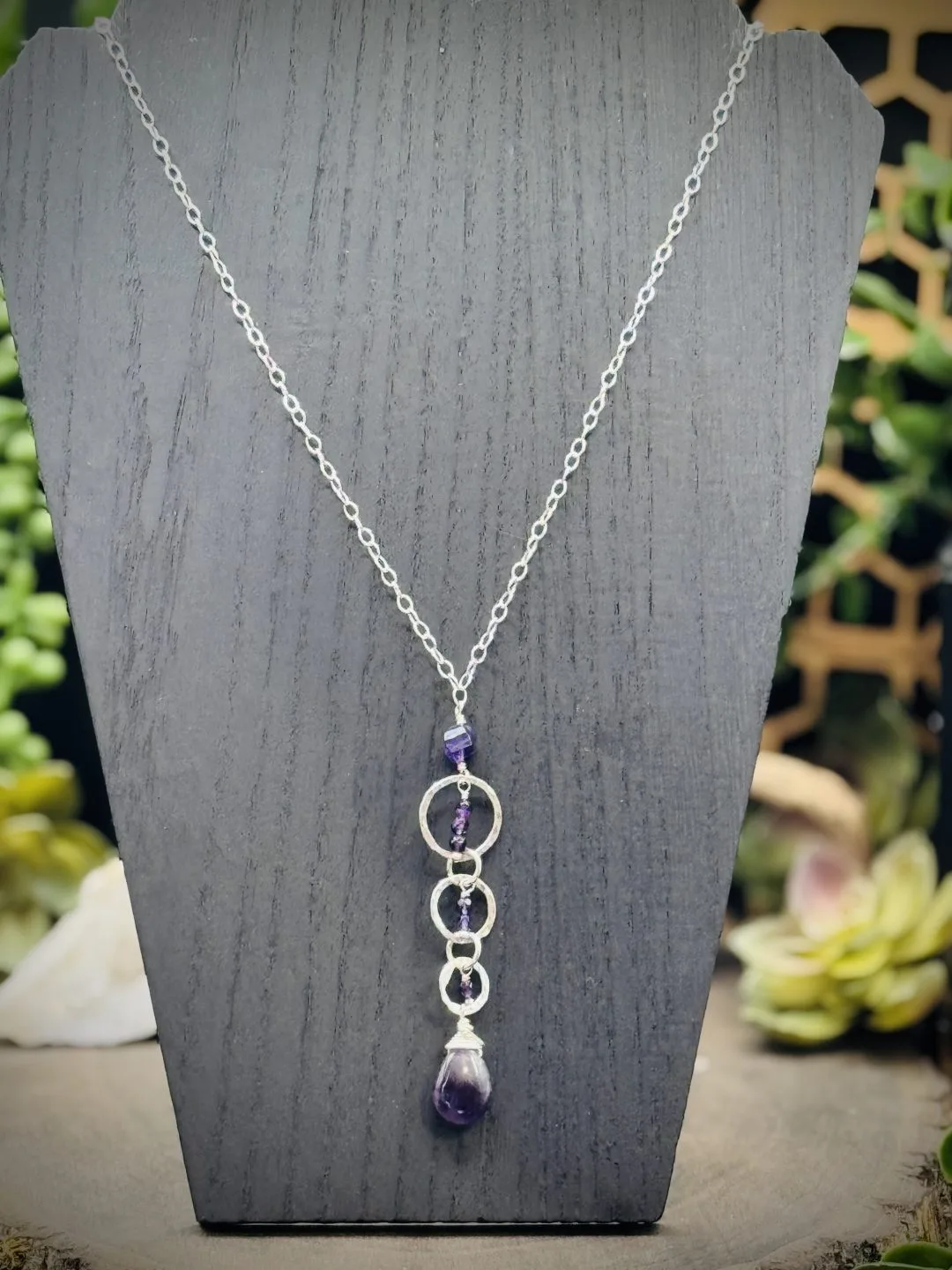 This Necklace is 20 Inches long. One Small, One X-Small, One XX-Small Fine Silver Round with Two Tiny Silver Rounds attaching the rounds together. This necklace comes with one large teardrop amethyst bead and smaller amethyst beads in the center of the rounds. With Sterling Silver Small Oval Chain.