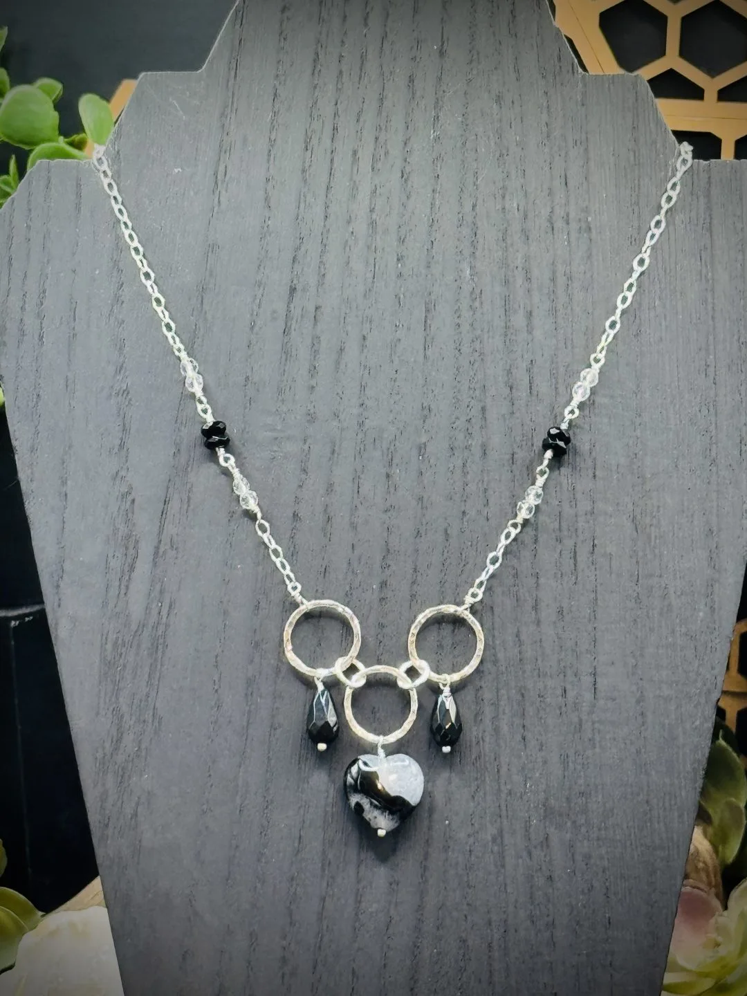 19 Inch Necklace with Three Small Rounds & Two XXX-Small Fine Silver Rounds connecting all the pieces together with Onyx & Quartz Heart Pendant, Black Obsidian, Onyx, & Clear Quartz Crystal Beads . With Sterling Silver Small Oval Chain.