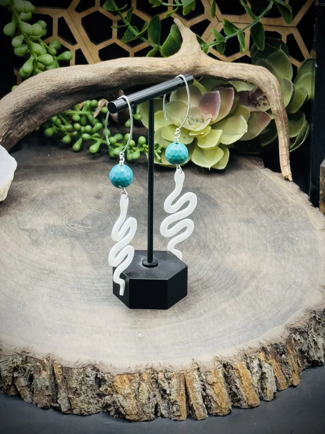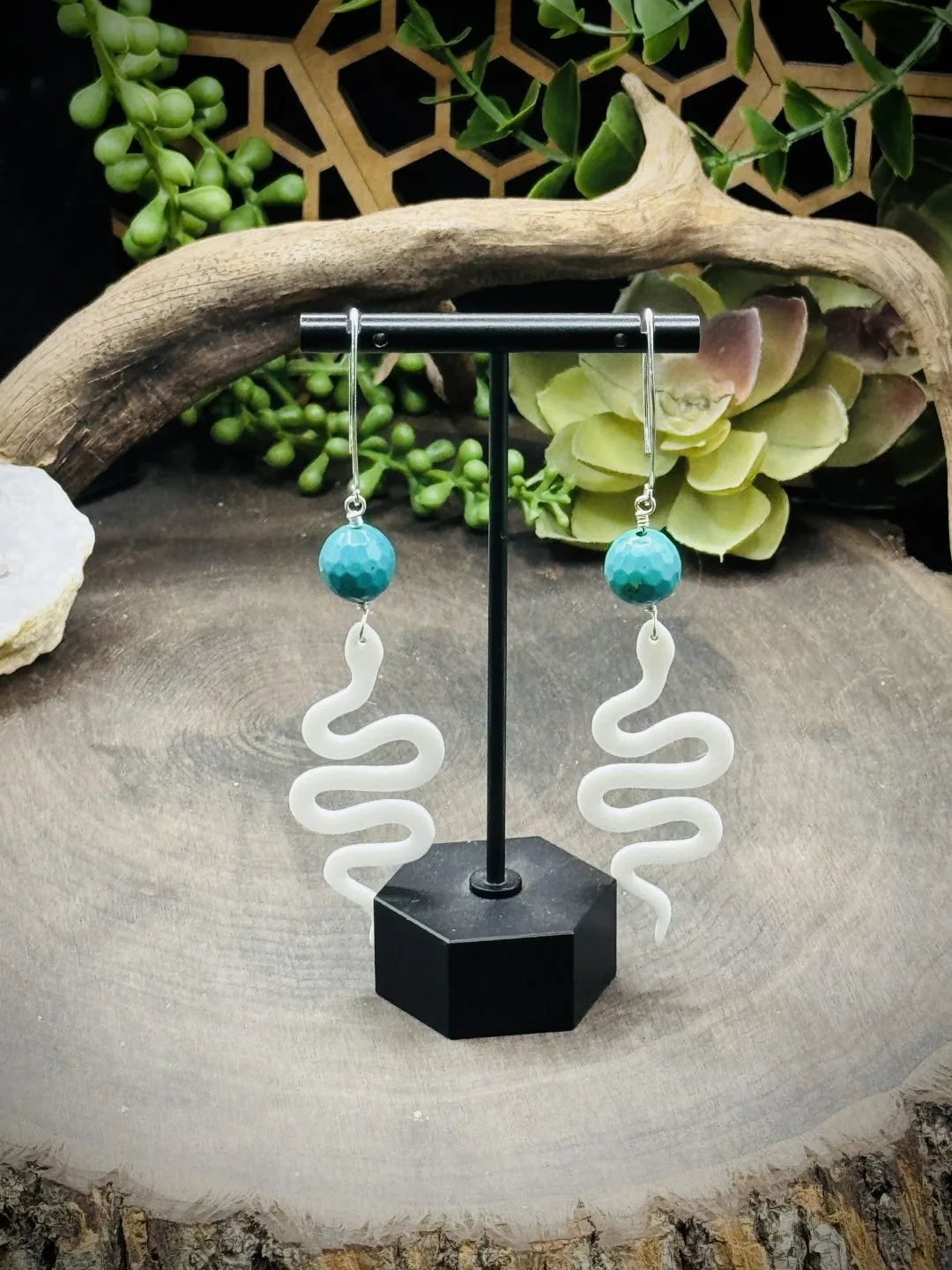 Marquise Ear Wires with Turquoise Beads and 3D printed white snake.