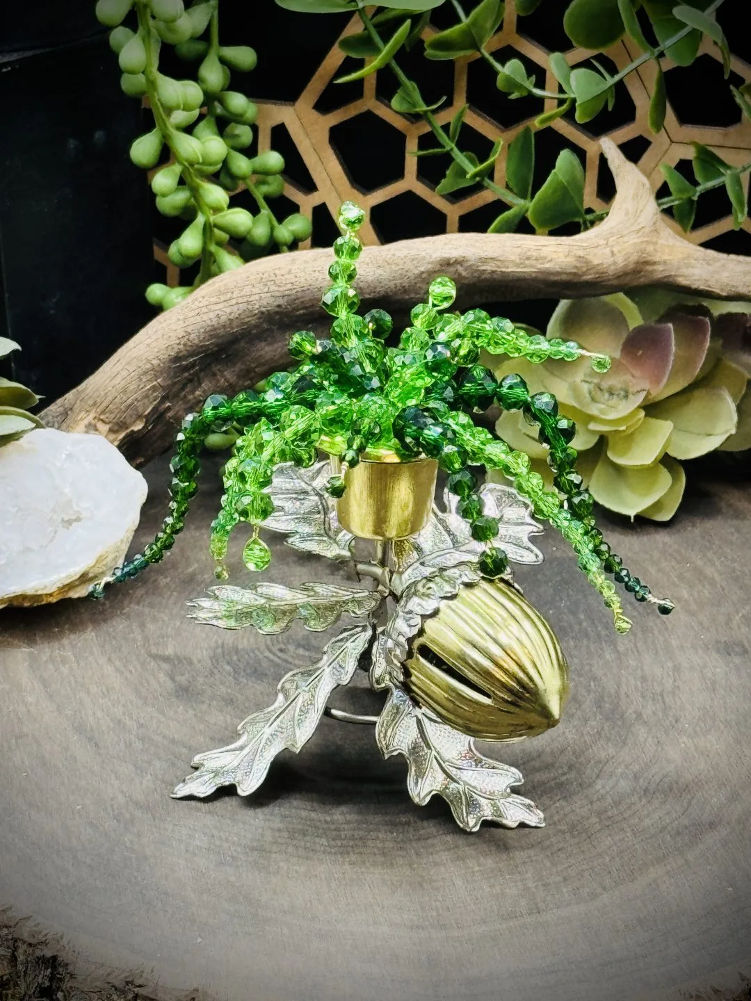 Small Beaded Plant Sun catcher in Vintage Gold & Silver Acorn Candle Holder