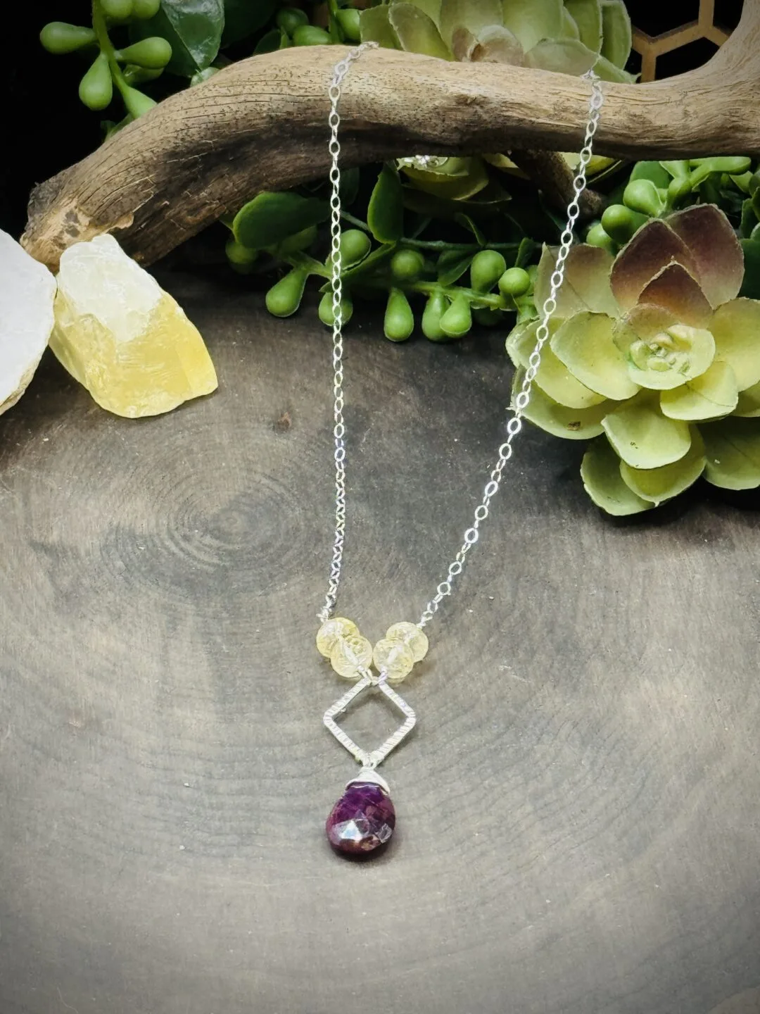 18 inch Necklace with a Small Fine Silver Diamond Shape Round with a Teardrop Ruby & Citrine Beads. With Sterling Silver Dainty Oval Chain.