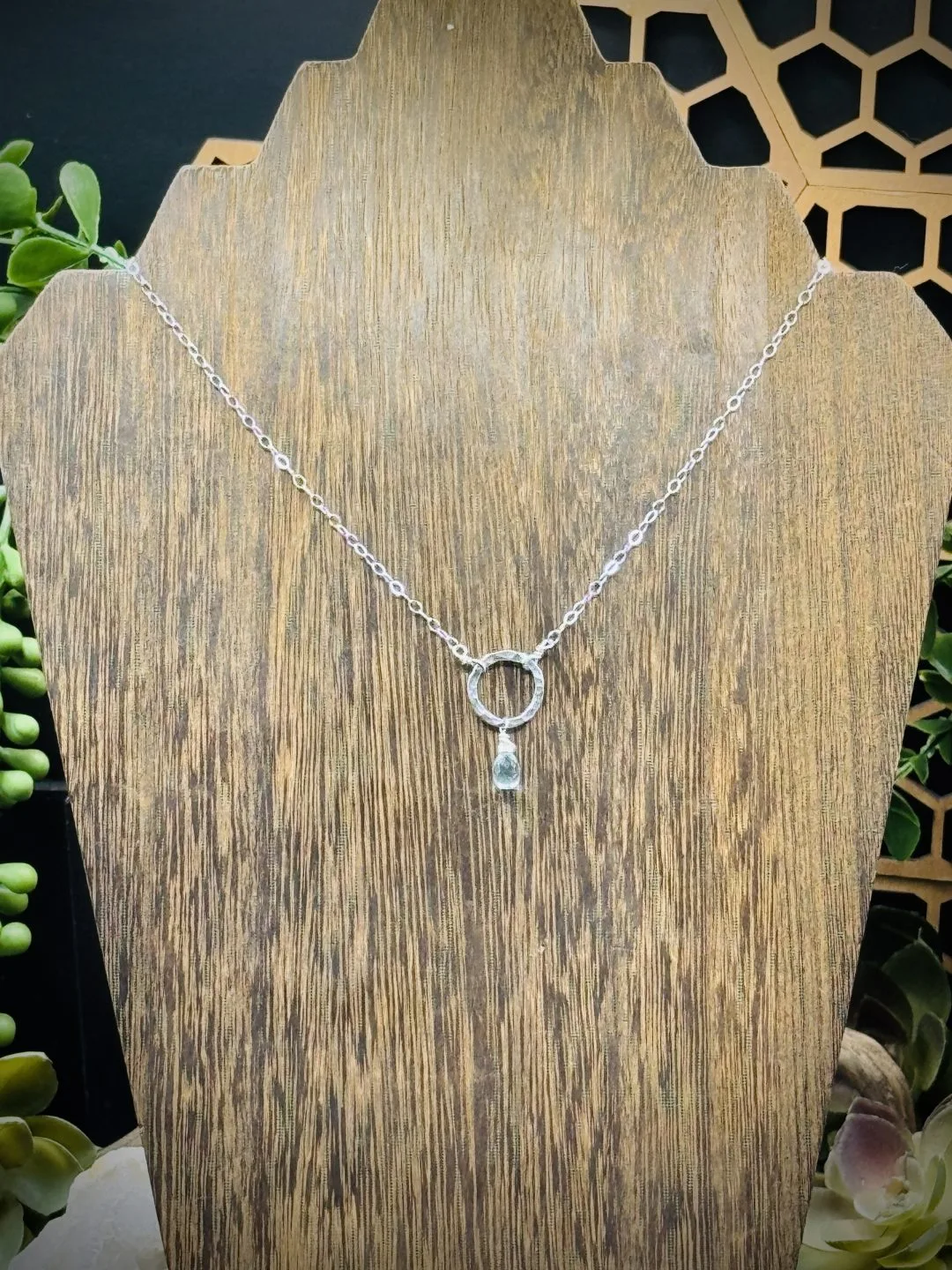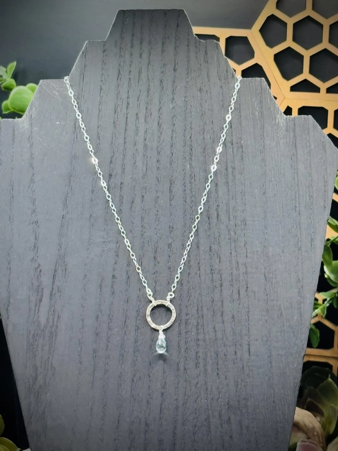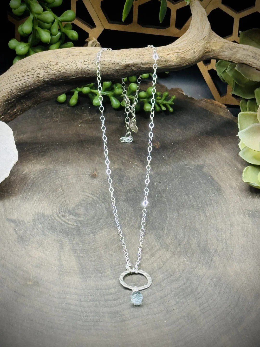 16 to 18 inch Choker Necklace with Small Fine Silver Round with a Teardrop Aquamarine Bead. With Sterling Silver Dainty Oval Chain.