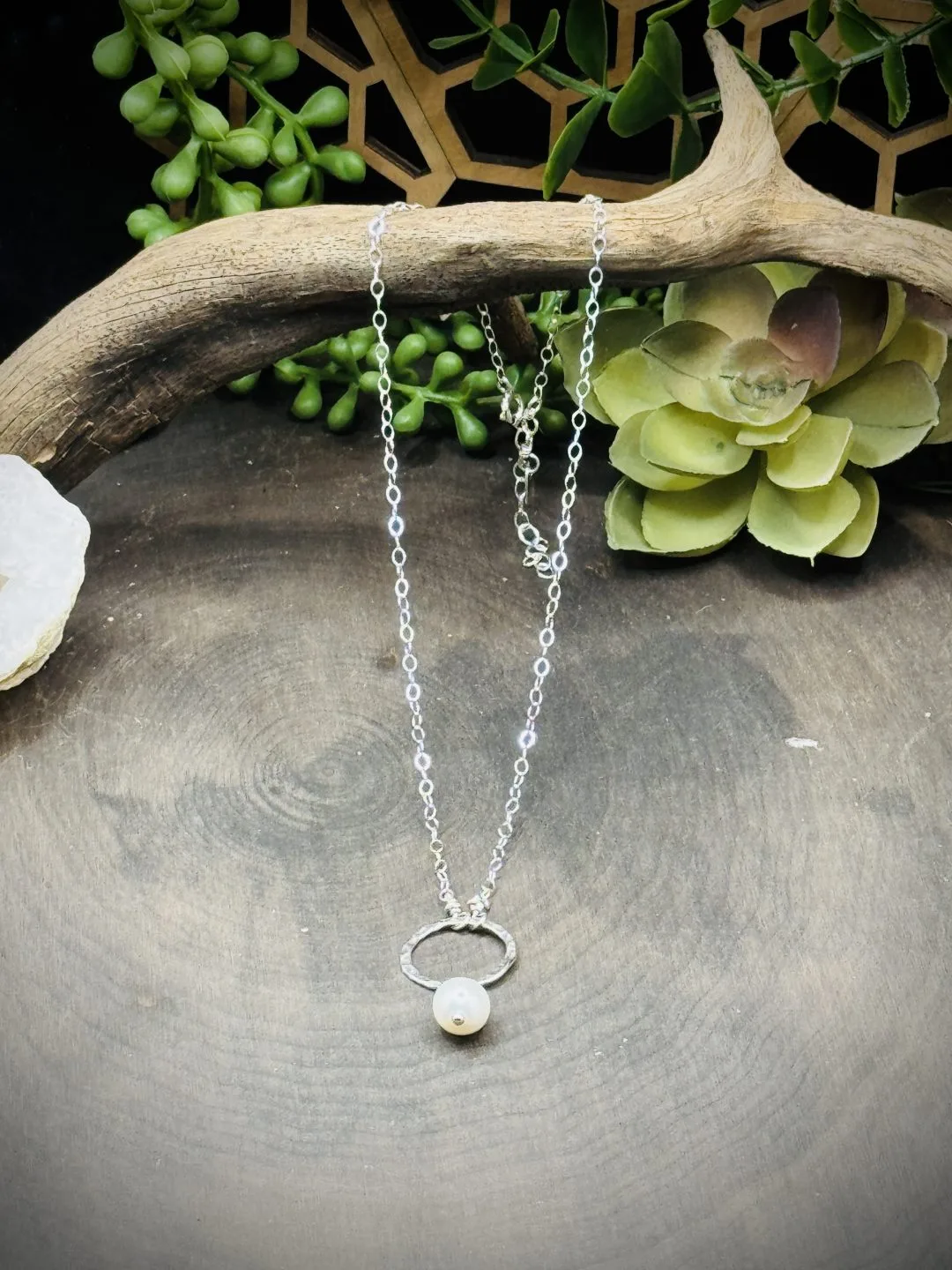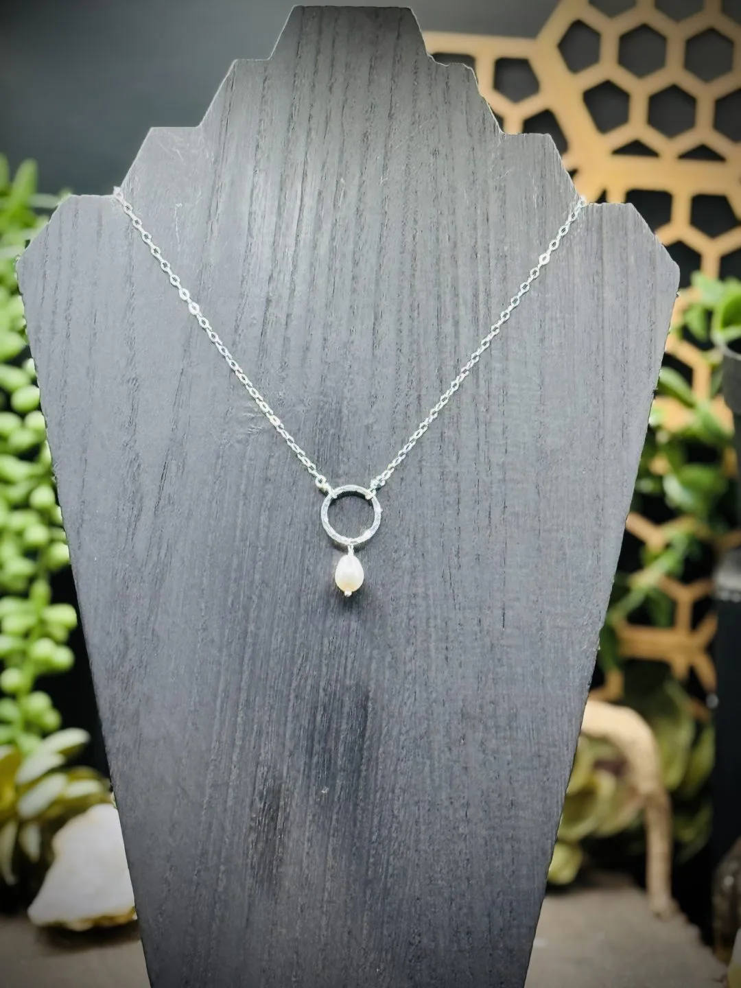 16 to 18 inch Choker Necklace with Small Fine Silver Round with a Teardrop Freshwater Pearl. With Sterling Silver Dainty Oval Chain.
