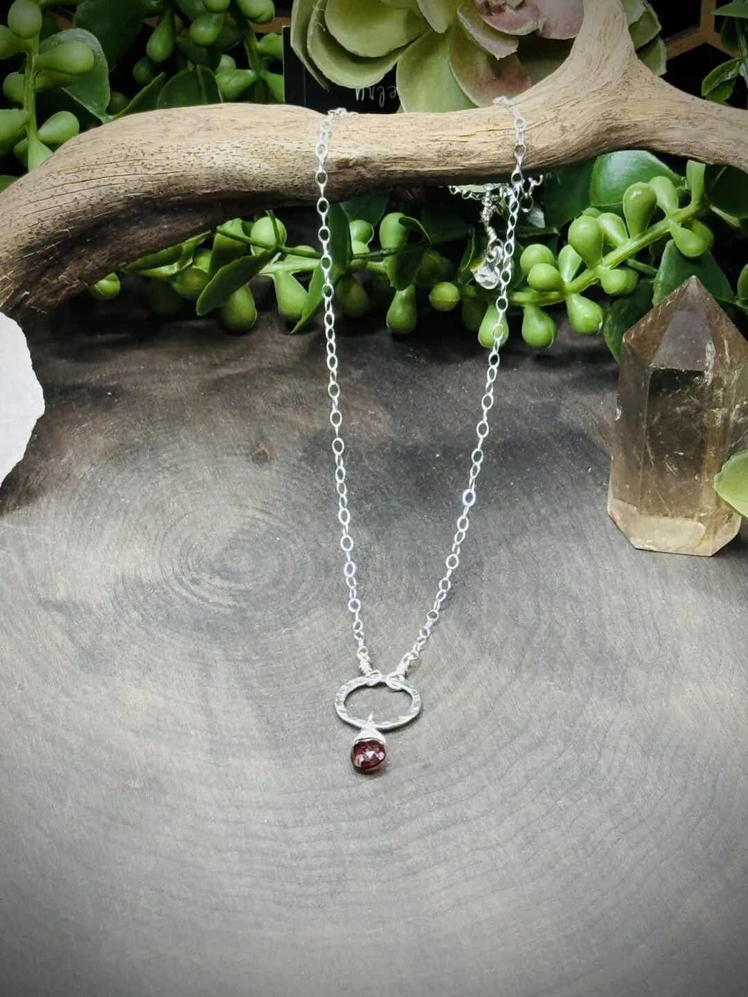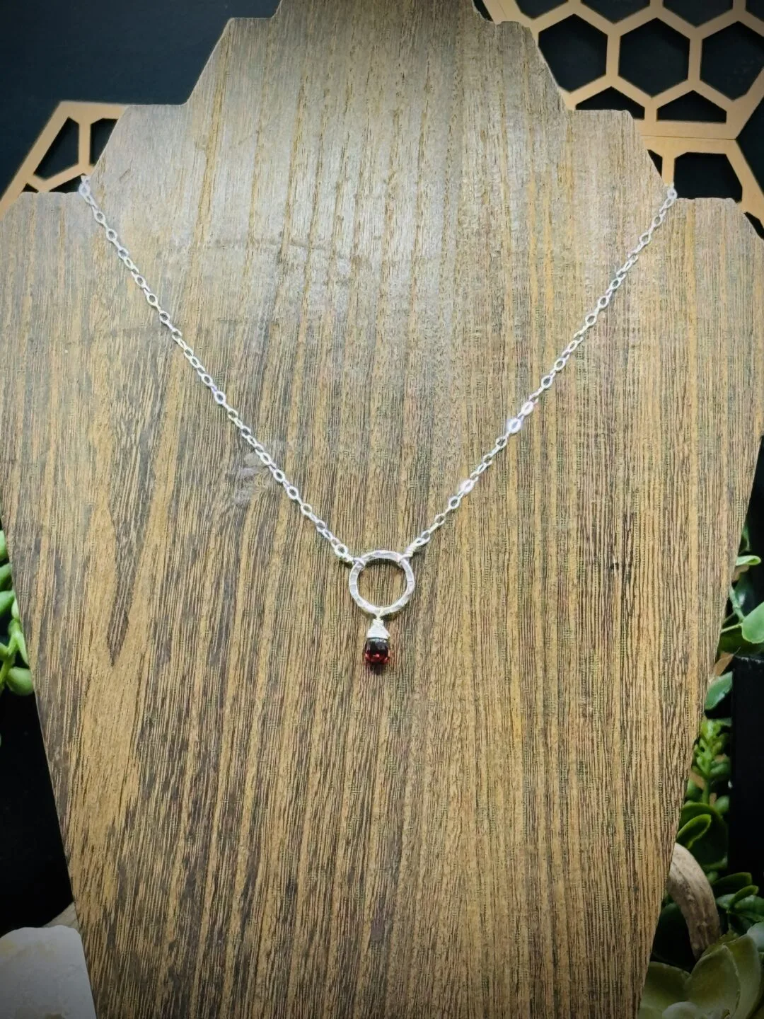 16 to 18 inch Choker Necklace with X-Small Fine Silver Round with a Teardrop Garnet Bead. With Sterling Silver Dainty Oval Chain.