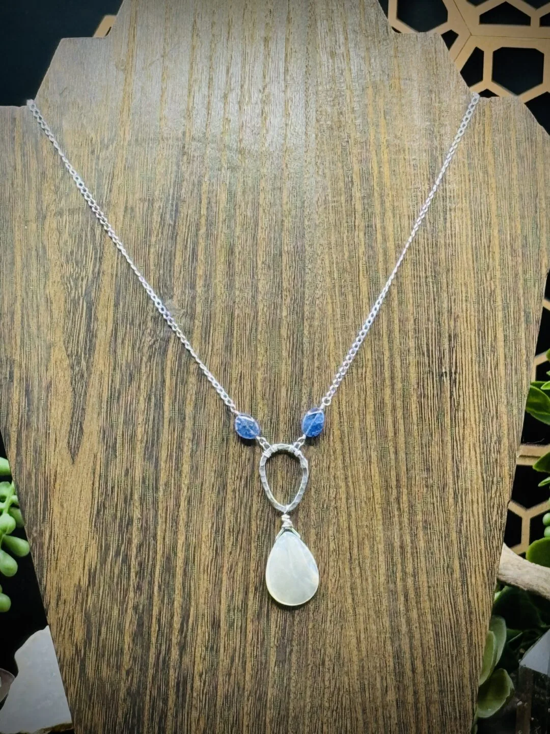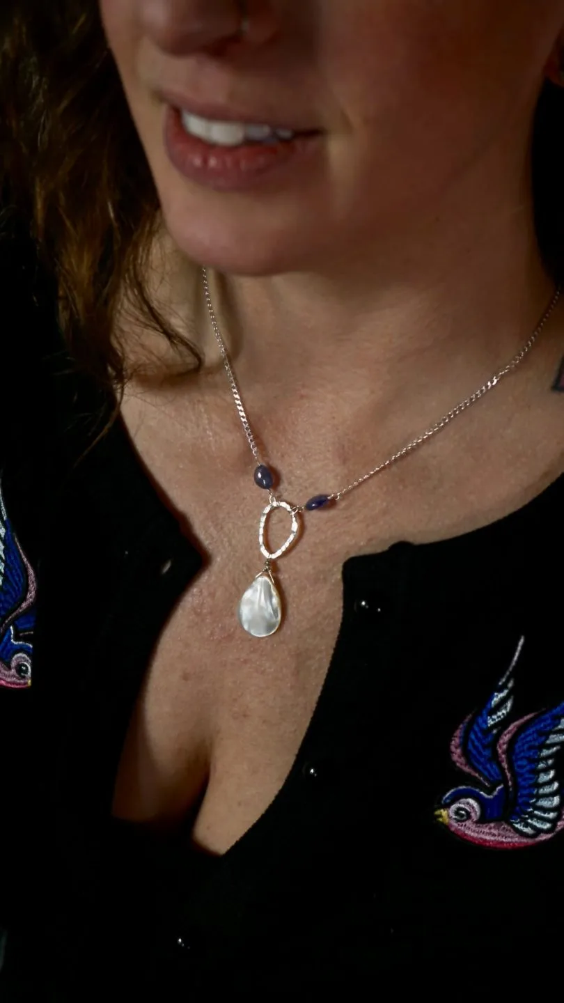18 inch Necklace with a Small Fine Silver Teardrop Shape Round with a Teardrop Mother of Pearl & Tanzanite Beads. With Sterling Silver Diamond Cut Chain.