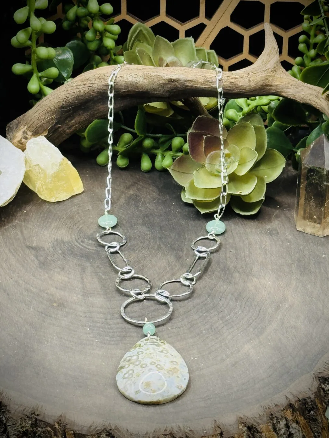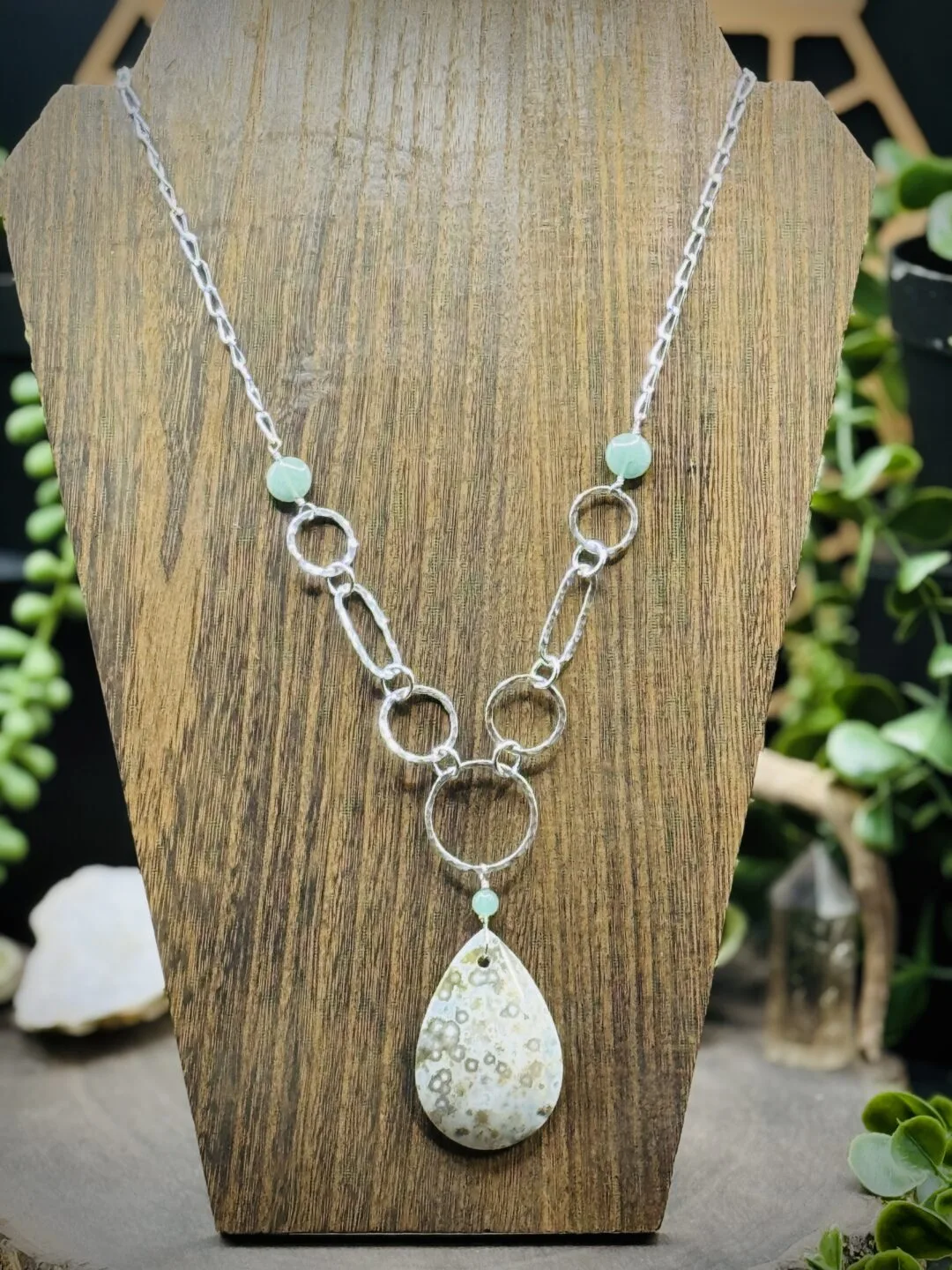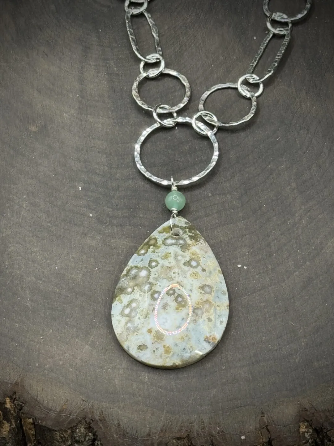 This Necklace is 22 Inches long. One Medium Round, Two Small Rounds, Two Small Oval Rounds, Two X-Small Round, & Six Tiny Fine Silver Rounds that attaches all the pieces together. This necklace comes with a larger Ocean Jasper Teardrop and Aventurine Beads. With Sterling Silver Medium Paperclip Chain.