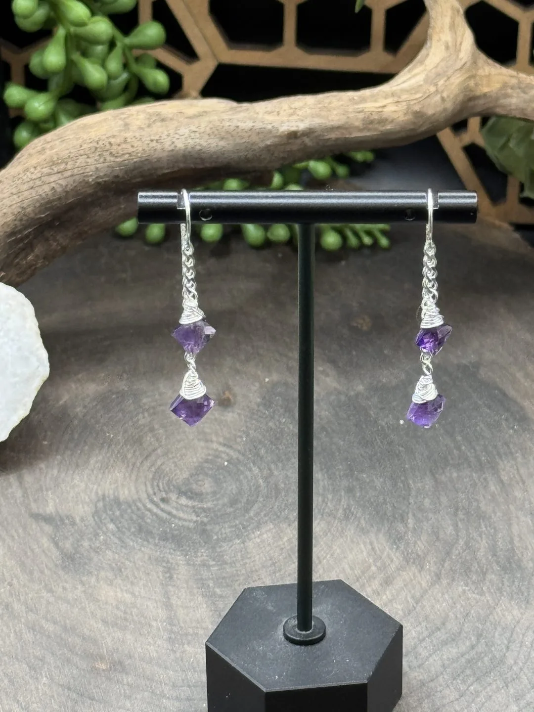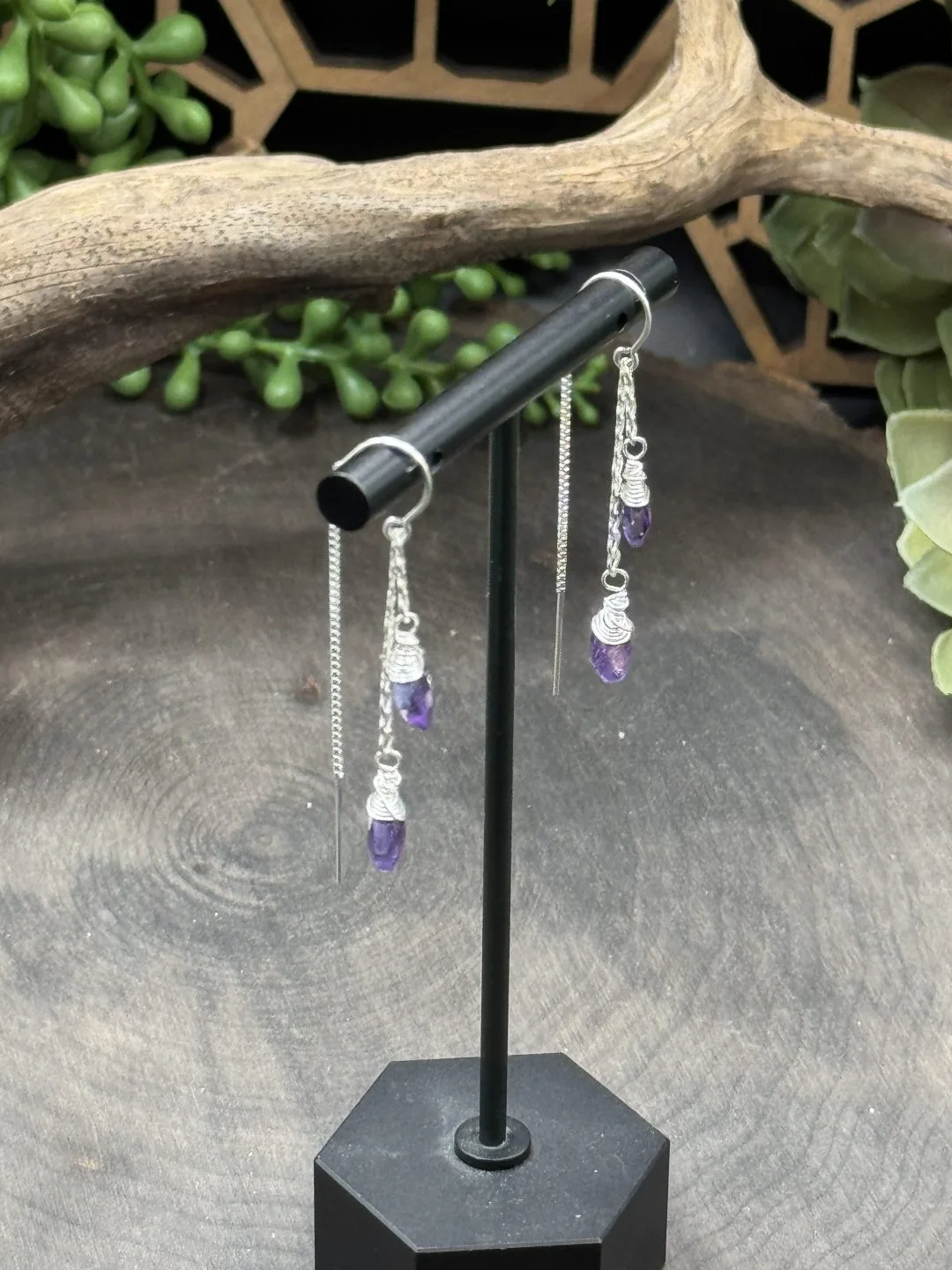 Sterling Silver Threader Earrings with Two Strands of Diamond Cut Sterling Silver Chains & Diamond Shaped Amethyst Beads.