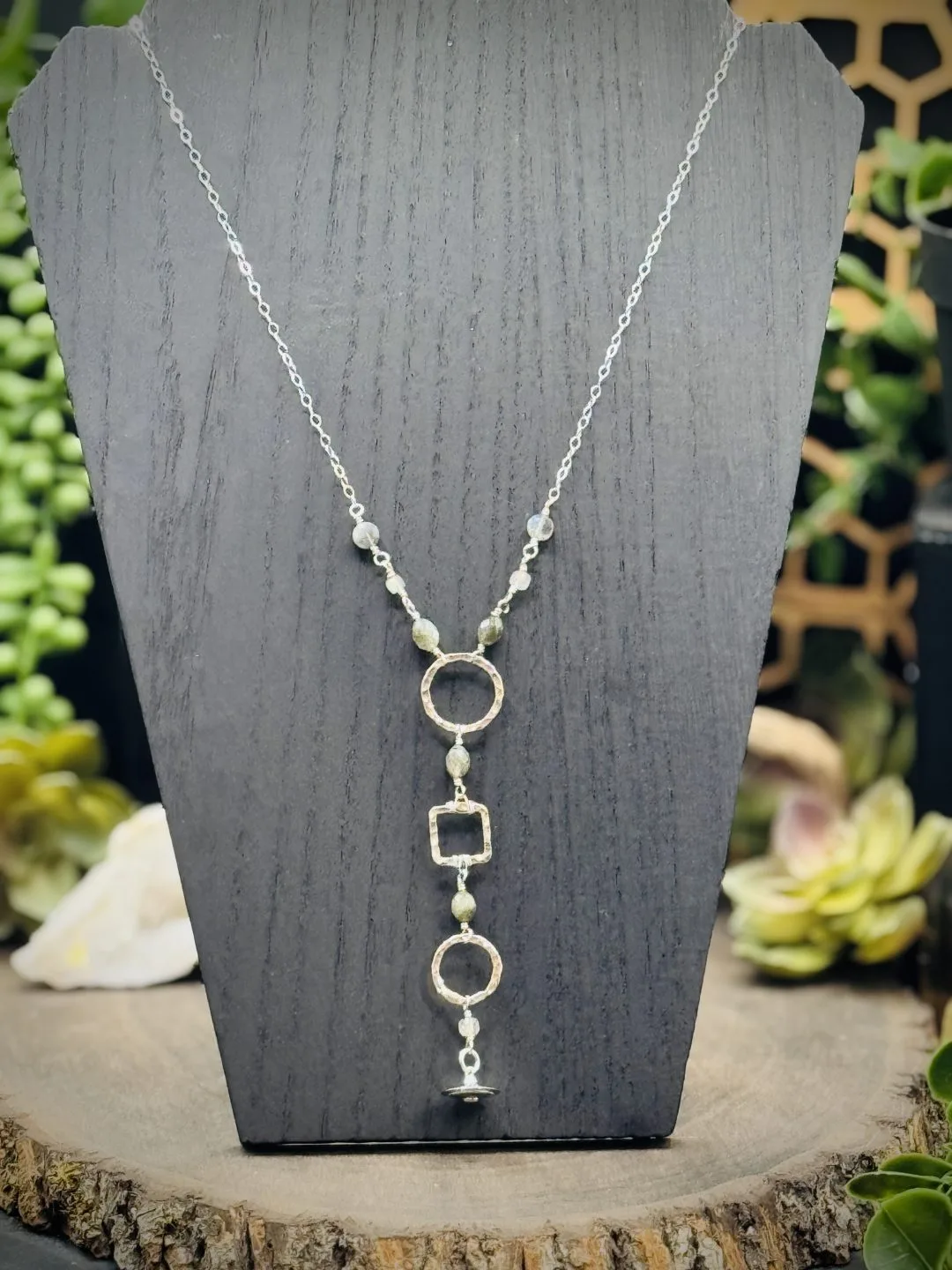 This Necklace is 23 Inches long. One Small Round, One X-Small Square Round, One X-Small Fine Silver Round. This necklace comes with Labradorite Beads and a Sterling Silver Flying Saucer. With Sterling Silver Dainty Oval Chain.