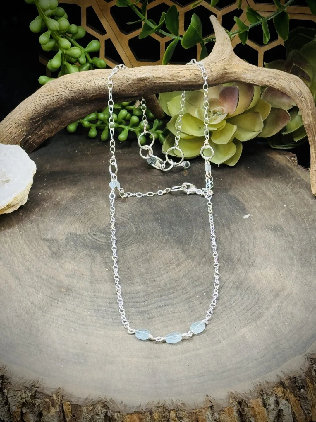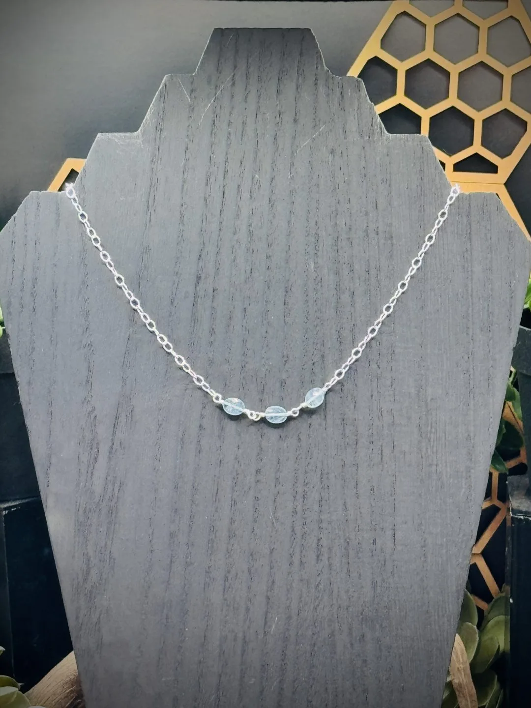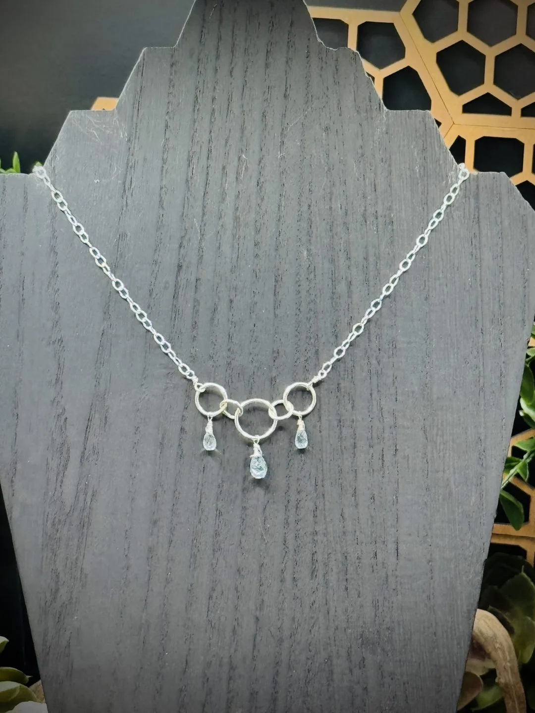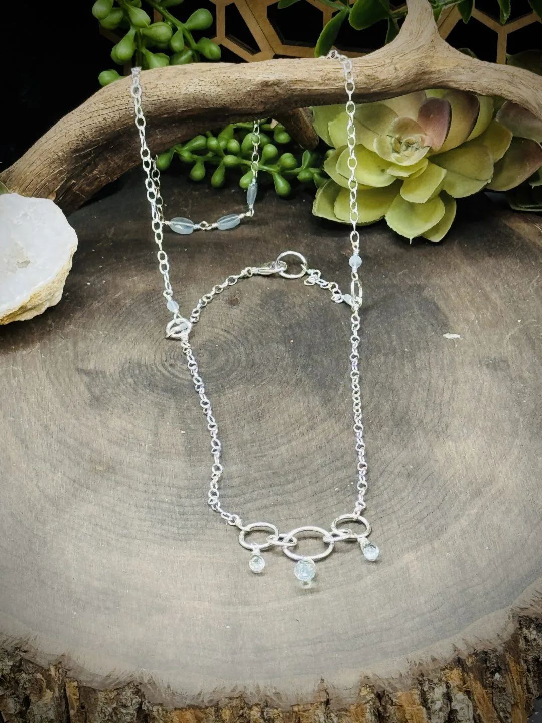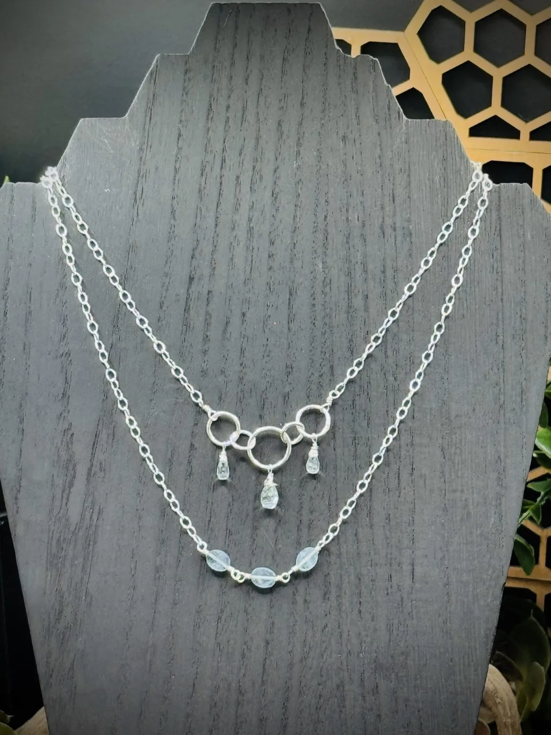 16 inch Three Way Reversible Choker Necklace. The one Pendant has Five Fine Silver Rounds. One XX-Small, Two XXX-Small, and Two Tiny Rounds that attach all the pieces together with three Aquamarine Teardrop Beads. There is two Tine Fine Silver Rounds that attaches all the chains together and allow the necklace to be worn three different ways. Then an XXX-Small Fine Silver Round that allows the sterling silver lobster clasp to attach to the necklace. All the chains are Sterling Small Oval Chain.